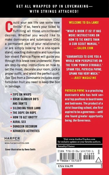 Get all wrapped up in lovemaking?with strings attached! Could your sex life use some new thrills? If so, here's your ticket to fulfilling all those unconfessed desires. Whether you would like to make dominance and submission (D/s) a permanent part of your relationship or are simply looking for a one-spank stand, exacting dominatrix and luxurious bon vivant Patricia Payne will guide you through this brave new underworld. Here are step-by-step instructions on how to set the mood, decorate your room, pick a proper outfit, and wield the perfect quirt. Sex Tips from a Dominatrix includes every forbidden fruit you need to keep the bon in bondage. * Tips on Whips * BDSM Glamour Do's and Don'ts * Silencing Your Lamb * The Dope on Rope * How to Get Knotty * Aural Sex * Dungeon Decorum * Advanced Activities
