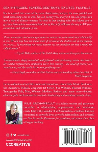 Sex Intrigues, Scares, Destroys, Excites, Fulfills Sex is a portal into some of the most elated states, and yet, the most painful and heart-wrenching ones as well. Sex can destroy you, and yet it can also propel you into a state of ultimate oneness. So what is that tipping point that allows you to go from destruction to construction? Sex up Your Life will pave the way to UP your connection and intimacy in sex. In this collection of real-life stories and interviews—from Indie Music Producers, International Sex Educators, Creatives, Models, Corporate Jet-Setters, Sex Workers, Bisexual Muslims, Transgender Folk undergoing gender reassignment, Men, Women, Mothers, Fathers, and many more—holistic educator Julie Archambault has crafted a fascinating and revealing portrait of sex. The founder of Co-creative Sex, Julie forges a new paradigm where sex, relationships, and personal growth go hand in hand. Everyone is dealing with something —and that something has a lot to teach you about yourself.Sex Up Your Life offers a unique "Continuum for Connection for Sex"—brought to life by collected stories of struggle and triumph—to guide you from destructive disconnect to blissful sexual for sex in your life. Order your copy of Sex Up Your Life today or click Amazon’s "Look Inside" feature to begin reading the first chapter.
