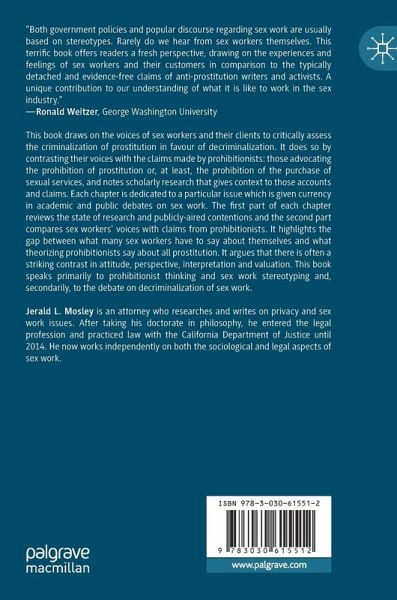 This book draws on the voices of sex workers and their clients to critically assess the criminalization of prostitution in favour of decriminalization. It does so by contrasting their voices with the claims made by prohibitionists: those advocating the prohibition of prostitution or, at least, the prohibition of the purchase of sexual services, and notes scholarly research that gives context to those accounts and claims. Each chapter is dedicated to a particular issue which is given currency in academic and public debates on sex work. The first part of each chapter reviews the state of research and publicly-aired contentions and the second part compares sex workers' voices with claims from prohibitionists. It highlights the gap between what many sex workers have to say about themselves and what theorizing prohibitionists say about all prostitution. It argues that there is often a striking contrast in attitude, perspective, interpretation and valuation. This books speaks primarilyto prohibitionist thinking and sex work stereotyping and, secondarily, to the debate on decriminalization of sex work.