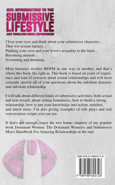 Add a healthy dose of BDSM to your sex life. Experience the difference. Most fantasies involve BDSM in one way or another, and that's where this book fits right in. This book is based on years of experience and tons of research about sexual relationships and will most certainly answer all of your questions about the sub/dom dynamic and sub/dom relationship. This book includes how to set boundaries, how to build a strong relationship, how to put your knowledge into action, your mindset, role plays, conversations script examples, and much more. If that's not enough, enjoy the two bonus chapters of my popular book Dominant Women: The Dominant Women's and Submissive Men's Handbook For Amazing Relationships at the end. Press the Buy-button, enjoy the book, and let me know if we can help you in any way! All the best, Alexandra