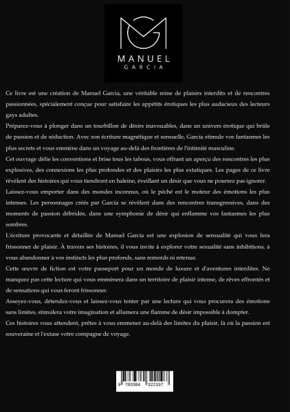 Ce livre est une création de Manuel Garcia, une véritable mine de plaisirs interdits et de rencontres passionnées, spécialement conçue pour satisfaire les appétits érotiques les plus audacieux des lecteurs gays adultes.Prépare-toi à te plonger dans un tourbillon de désirs inavouables, dans un univers érotique qui brûle de passion et de séduction. Avec son écriture magnétique et sensuelle, Garcia stimule tes fantasmes les plus secrets, t'emmenant dans un voyage au-delà des frontières de l'intimité masculine.Cet ouvrage défie les conventions et brise tous les tabous, t'offrant un aperçu des rencontres les plus explosives, des connexions les plus profondes et des plaisirs les plus extatiques. Les pages de ce livre révèlent des histoires qui te tiendront collé aux mots, éveillant un désir que tu ne pourras pas ignorer.Laisse-toi emporter dans des mondes inconnus, où le péché est le moteur des émotions les plus intenses. Les personnages créés par García se révèlent dans des rencontrestransgressives, dans des moments de passion débridée, dans une symphonie de désir qui enflamme tes fantasmes les plus sombres.L'écriture provocante et détaillée de Manuel García est une explosion de sensualité qui te fera frissonner de plaisir. À travers ses histoires, il t'invite à explorer ta sexualité sans inhibitions, à t'abandonner à tes instincts les plus profonds, sans remords ni retenue.Cette oeuvre de fiction est ton passeport pour un monde de luxure et d'aventures interdites. Ne manque pas cette lecture qui t'emmènera dans un territoire de plaisir intense, de rêves effrontés et de sensations qui te feront frissonner.Assieds-toi, détends-toi et laisse-toi aller à une lecture qui te procurera des émotions sans limites, stimulera ton imagination et allumera une flamme de désir qui ne peut être apprivoisée.Ces histoires t'attendent, prêtes à t'emmener au-delà des limites du plaisir, là où la passion est souveraine et où l'extase est ton compagnon de voyage.