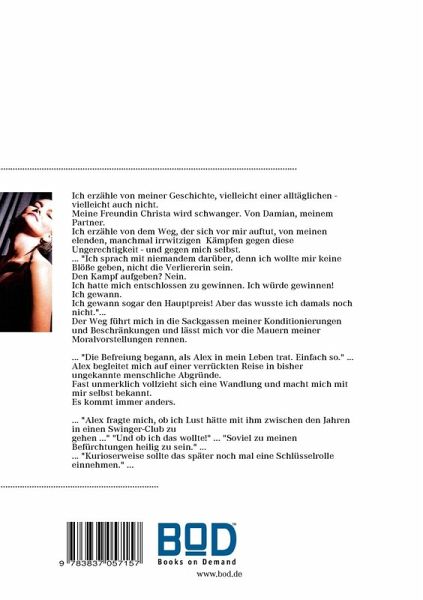 Ich erzähle von meiner Geschichte, vielleicht einer alltäglichen - vielleicht auch nicht.Meine Freundin Christa wird schwanger. Von Damian, meinem Partner.Ich erzähle von dem Weg, der sich vor mir auftut, von meinen elenden, manchmal irrwitzigen Kämpfen gegen diese Ungerechtigkeit - und gegen mich selbst. ... "Ich sprach mit niemandem darüber, denn ich wollte mir keine Blöße geben, nicht die Verliererin sein. Den Kampf aufgeben? Nein. Ich hatte mich entschlossen zu gewinnen. Ich würde gewinnen!Ich gewann.Ich gewann sogar den Hauptpreis! Aber das wusste ich damals noch nicht."...Der Weg führt mich in die Sackgassen meiner Konditionierungen und Beschränkungen und lässt mich vor die Mauern meiner Moralvorstellungen rennen. ... "Die Befreiung begann, als Alex in mein Leben trat. Einfach so." ...Alex begleitet mich auf einer verrückten Reise in bisher ungekannte menschliche Abgründe. Fast unmerklich vollzieht sich eine Wandlung und macht mich mit mir selbst bekannt. Es kommt immer anders.... "Alex fragte mich, ob ich Lust hätte mit ihm zwischen den Jahren in einen Swinger-Club zu gehen ..." "Und ob ich das wollte!" ... "Soviel zu meinen Befürchtungen heilig zu sein." ...... "Kurioserweise sollte das später noch mal eine Schlüsselrolle einnehmen." ...