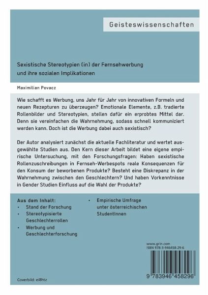 Das Fernsehen ist nach wie vor eine bedeutende Größe in unserem Alltag. Wie schafft es Werbung, uns Jahr für Jahr von innovativen Formeln und neuen Rezepturen zu überzeugen? Emotionale Elemente, z.B. tradierte Rollenbilder und Stereotypien, stellen ein erprobtes Mittel dar. Denn sie vereinfachen die Wahrnehmung, sodass schnell kommuniziert werden kann. Doch ist die Werbung dabei auch sexistisch?Der Autor analysiert zunächst die aktuelle Fachliteratur und wertet ausgewählte Studien aus. Den Kern dieser Arbeit bildet aber eine eigene empirische Untersuchung, mit den Forschungsfragen: Haben sexistische Rollenzuschreibungen in Fernseh-Werbespots reale Konsequenzen für den Konsum der beworbenen Produkte? Besteht eine Diskrepanz in der Wahrnehmung zwischen den Geschlechtern? Und haben Vorkenntnisse der Gender Studien Einfluss auf die Wahl der Produkte?Aus dem Inhalt:- Stand der Forschung,- Stereotypisierte Geschlechterrollen,- Werbung und Geschlechterforschung,- Empirische Umfrage unter österreichischen StudentInnen