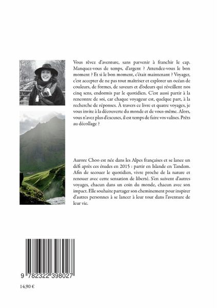Vous rêvez d'aventure, sans parvenir à franchir le cap. Manquez-vous de temps, d'argent ? Attendez-vous le bon moment ? Et si le bon moment, c'était maintenant ? Voyager, c'est accepter de ne pas tout maîtriser et explorer un océan de couleurs, de formes, de saveurs et d'odeurs qui réveillent nos cinq sens, endormis par le quotidien. C'est aussi partir à la rencontre de soi, car chaque voyageur est, quelque part, à la recherche de réponses. A travers ce livre et quatre voyages, je vous invite à la découverte du monde et de vous-même. Alors, vous n'avez plus d'excuses, il est temps de faire vos valises. Prêts au décollage ?
