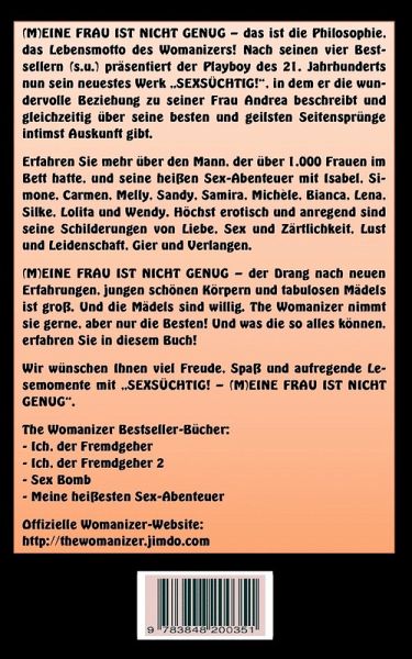 (M)EINE FRAU IST NICHT GENUG - das ist die Philosophie, das Lebensmotto des Womanizers! Nach seiner Bestseller-Reihe "Ich, der Fremdgeher" präsentiert der Playboy des 21. Jahrhunderts nun sein neuestes Werk "Sexsüchtig!", in dem er die wundervolle Beziehung zu seiner Ehefrau Andrea beschreibt und gleichzeitig über seine geilsten Seitensprünge intimst Auskunft gibt. Erfahre mehr über den Mann, der schon über 1.500 Frauen im Bett hatte, und seine heißen Abenteuer mit Isabel, Simone, Carmen, Melly, Sandy, Samira, Michèle, Bianca, Lena, Silke, Lolita und Wendy. Höchst erotisch sind seine Schilderungen von Liebe, Sex und Zärtlichkeit, Lust und Leidenschaft, Gier und Verlangen. (M)EINE FRAU IST NICHT GENUG - der Drang nach neuen Erfahrungen, nach jungen, schönen Körpern und tabulosen Mädels ist groß. Und die Ladys sind willig. The Womanizer nimmt sie gerne, aber nur die Besten! Und was die so alles können, erfährst du in diesem Buch.