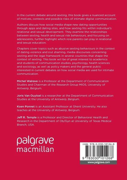 In the current debate around sexting, this book gives a nuanced account of motives, contexts and possible risks of intimate digital communication. Authors discuss how social media shape new dating opportunities through apps and dating sites, how sexting fits within individual's relational and sexual development. They examine the relationships between sexting, health and sexual risk behaviours and focusing on adolescents, further highlight which role parents can play in relational and sexual education.