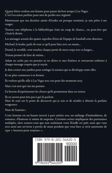 Quatre frères veulent une femme pour passer du bon temps à Las Vegas. C'est l'occasion parfaite pour moi de perdre ma virginité. Maintenant que ma dernière année d'études est presque terminée, je suis prête à me venger. Trouver son téléphone à la bibliothèque était un coup de chance... ou peut-être que c'était le destin. Les messages sexuels des quatre superbes frères de l'équipe de baseball sont obscènes. Michael, le leader, parle de tout ce qu'il peut faire avec ses mains... Daniel, le sensible, veut toucher chaque partie de mon corps avec sa langue... Tristan promet de faire de même... Adam ne cache pas ses pensées ni ses désirs et mes fenêtres se retrouvent embuées à chaque message coquin que je reçois. Je dois croiser mes jambes pour soulager la tension qui se développe entre elles. Et un plan commence à se former. Ils veulent qu'elle aille à Las Vegas avec eux pour des moments sexy. Mais c'est moi qui vais me pointer. J'ai besoin d'expérimenter les choses qu'ils promettent dans ces textos. Ils ne savent peut-être pas à qui ils parlent. Mais ils sont sur le point de découvrir qui je suis et de m'aider à obtenir la parfaite vengeance. Note de l'auteure : Cette histoire est un harem inversé à part entière avec un mélange d'intimidation, de romance, d'humour et même de suspense. Certaines scènes impliquent des partenaires multiples, alors assurez-vous que non seulement votre Kindle est prêt, mais que vous avez aussi une serviette à portée de main pendant que vous lisez ce récit autonome de type « heureux pour toujours ».