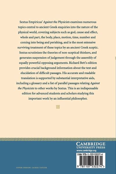Sextus Empiricus' Against the Physicists examines numerous topics central to ancient Greek inquiries into the nature of the physical world, covering subjects such as god, cause and effect, whole and part, bodies, place, motion, time, number, coming into being and perishing and is the most extensive surviving treatment of these topics by an ancient Greek sceptic. Sextus scrutinizes the theories of non-sceptical thinkers and generates suspension of judgement through the assembly of equally powerful opposing arguments. Richard Bett's edition provides crucial background information about the text and elucidation of difficult passages. His accurate and readable translation is supported by substantial interpretative aids, including a glossary and a list of parallel passages relating Against the Physicists to other works by Sextus. This is an indispensable edition for advanced students and scholars studying this important work by an influential philosopher.