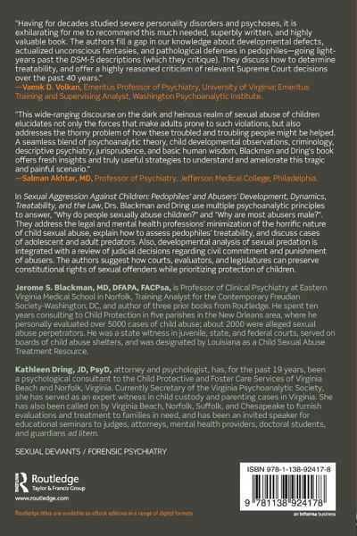 In Sexual Aggression Against Children: Pedophiles' and Abusers' Development, Dynamics, Treatability, and the Law, Drs. Blackman and Dring use multiple psychoanalytic principles to answer, "Why do people sexually abuse children?" and "Why are most abusers male"? They address the legal and mental health professions' minimization of the horrific nature of child sexual abuse, explain how to assess pedophiles' treatability, and discuss cases of adolescent and adult predators. Also, developmental analysis of sexual predation is integrated with a review of judicial decisions regarding civil commitment and punishment of abusers. The authors suggest how courts, evaluators, and legislatures can preserve constitutional rights of sexual offenders while prioritizing protection of children.