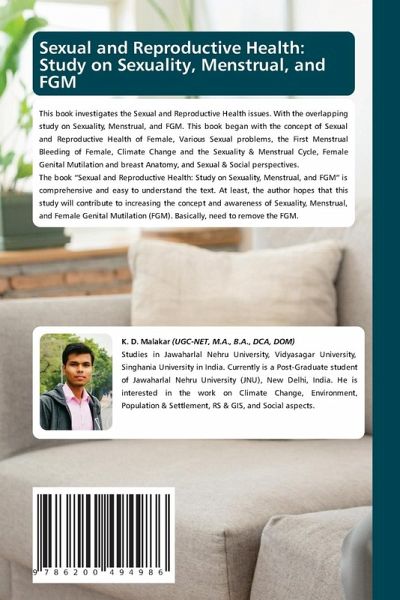 This book investigates the Sexual and Reproductive Health issues. With the overlapping study on Sexuality, Menstrual, and FGM. This book began with the concept of Sexual and Reproductive Health of Female, Various Sexual problems, the First Menstrual Bleeding of Female, Climate Change and the Sexuality & Menstrual Cycle, Female Genital Mutilation and breast Anatomy, and Sexual & Social perspectives.The book "Sexual and Reproductive Health: Study on Sexuality, Menstrual, and FGM" is comprehensive and easy to understand the text. At least, the author hopes that this study will contribute to increasing the concept and awareness of Sexuality, Menstrual, and Female Genital Mutilation (FGM). Basically, need to remove the FGM.