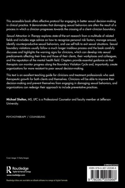 Sexual Attraction in Therapy explores state-of-the art research from a multitude of related fields and includes sage advice on how to recognize personal risk factors, manage arousal, identify counterproductive sexual behaviors, and use self-talk to exit sexual situations. Sexual boundary violations usually follow a much longer insidious process and the book carefully discusses and highlights the warning signs for clinicians, which can develop into sexual predicaments affecting their lives and those of their clients, their workplaces and colleagues, and the reputation of the mental health field. Chapters provide essential guidance so that therapists can monitor progress along the 'sexual decision cycle' and, importantly, create organizations far more resistant to poor sexual decision-making.