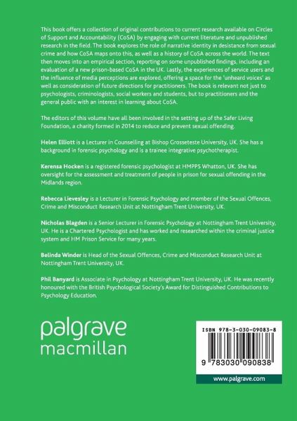 This book offers a collection of original contributions to current research available on Circles of Support and Accountability (CoSA) by engaging with current literature and unpublished research in the field. The book explores the role of narrative identity in desistance from sexual crime and how CoSA maps onto this, as well as a history of CoSA across the world. The text then moves into an empirical section, reporting on some unpublished findings, including an evaluation of a new prison-based CoSA in the UK. Lastly, the experiences of service users and the influence of media perceptions are explored, offering a space for the 'unheard voices' as well as consideration of future directions for practitioners. The book is relevant not just to psychologists, criminologists, social workers and students, but to practitioners and the general public with an interest in learning about CoSA.