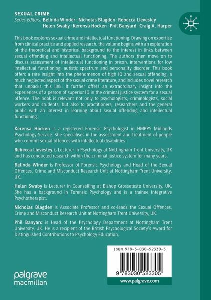 This book explores sexual crime and intellectual functioning. Drawing on expertise from clinical practice and applied research, the volume begins with an exploration of the theoretical and historical background to the interest in links between sexual offending and intellectual functioning. The authors then move on to discuss assessment of intellectual functioning in prison, interventions for low intellectual functioning, autistic spectrum and personality disorder. This book offers a rare insight into the phenomenon of high IQ and sexual offending, a much neglected aspect of the sexual crime literature, and includes novel research that unpacks this link. It further offers an extraordinary insight into the experiences of a person of superior IQ in the criminal justice system for a sexual offence.