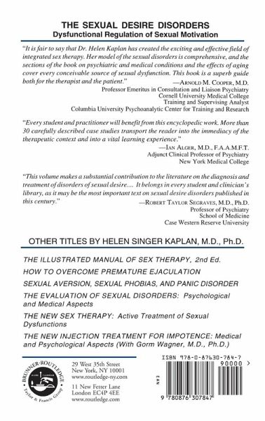 Almost two decades ago, Dr. Helen Kaplan was the first to identify the disorders of sexual desire as distinct entities, thus showing the way to more effective treatment of all the sexual disorders. Now, in this new volume, drawing upon her systematic recording of the treatment experience and outcome of over 6,000 patients whom she has treated - and by recognizing and studying not just the successes but the treatment failures as well - Dr. Kaplan has brought the art and science of sex therapy to new levels of clarity and effectiveness. In The Sexual Desire Disorders, Dr. Kaplan applies her comprehensive, integrated, psychodynamically oriented approach to arrive at an individualized treatment attuned to the specific diagnosis and unique circumstances of each patient. In addition, the author examines psychiatric disorders that can lead to loss of sexual desire, as well as organic causes, including medical conditions, drugs, and aging. Throughout the volume, more than 30 case studies illuminate the varied clinical approaches to the various disorders of sexual desire. The Sexual Desire Disorders provides a remarkable synthesis of trailblazing theory, painstaking research, and highly focused clinical treatment that will make this volume an indispensable guide for many years to come.