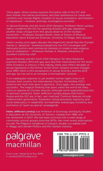 "In Sexual Diversity and the Sochi 2014 Olympics, Professor Helen Lenskyj rightly condemns the IOC for ignoring Russia's anti-gay legislation. The IOC's silence, Lenskyj laments, belies its claim of moral leadership and reaffirms its tradition of side stepping issues of social justice. Another sharp critique from this astute observer of the Olympic movement." - Professor Douglas Booth, Dean of School of Physical Education, Sport & Exercise Sciences, University of Otago, New Zealand