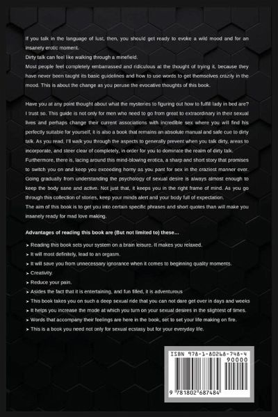 If you talk in the language of lust, then, you should get ready to evoke a wild mood and for an insanely erotic moment Dirty talk can feel like walking through a minefield. Most people feel completely embarrassed and ridiculous at the thought of trying it, because they have never been taught its basic guidelines and how to use words to get themselves crazily in the mood. This is about the change as you peruse the evocative thoughts of this book. The aim of this book is to get you into certain specific phrases and short quotes that will make you insanely ready for mad lovemaking. Advantages of reading this book are (But not limited to) these...Reading this book sets your system on brain leisure. It makes you relaxed. It will, most definitely, lead to an orgasm. It will save you from unnecessary ignorance when it comes to beginning quality moments. Creativity. Reduce your pain. This book will help you to get vocal with what you want. Asides from the fact that it is entertaining, and fun-filled, it is adventurous This book takes you on such a deep sexual ride that you can not dare get over in days and weeks It helps you increase the mode at which you turn on your sexual desires in the slightest of times. Words that accompany their feelings are here in the book, set to set your life-making on fire. This is a book you need not only for sexual ecstasy but for your everyday life. Considering the, when it comes reading this erotica, fun and total entertainment is what you would find which is good for your sex life. It provides your mind with an assurance that can lead to more orgasms and better sex. What are you waiting for? Order for yours now!