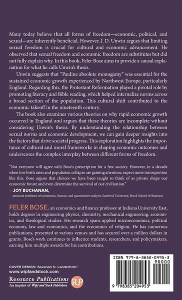 Many today believe that all forms of freedom--economic, political, and sexual--are inherently beneficial. However, J. D. Unwin argues that limiting sexual freedom is crucial for cultural and economic advancement. He observed that sexual freedom and economic freedom are substitutes but did not fully explain why. In this book, Feler Bose aims to provide a causal explanation for what he calls Unwin's thesis. Unwin suggests that "Pauline absolute monogamy" was essential for the sustained economic growth experienced by Northwest Europe, particularly England. Regarding this, the Protestant Reformation played a pivotal role by promoting literacy and Bible reading, which helped internalize norms across a broad section of the population. This cultural shift contributed to the economic takeoff in the nineteenth century. The book also examines various theories on why rapid economic growth occurred in England and argues that these theories are incomplete without considering Unwin's thesis. By understanding the relationship between sexual norms and economic development, we can gain deeper insights into the factors that drive societal progress. This exploration highlights the importance of cultural and moral frameworks in shaping economic outcomes and underscores the complex interplay between different forms of freedom.
