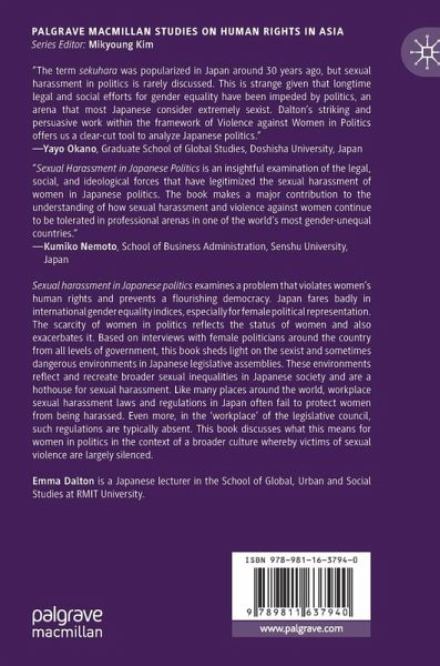 Sexual harassment in Japanese politics examines a problem that violates women's human rights and prevents a flourishing democracy. Japan fares badly in international gender equality indices, especially for female political representation. The scarcity of women in politics reflects the status of women and also exacerbates it. Based on interviews with female politicians around the country from all levels of government, this book sheds light on the sexist and sometimes dangerous environments in Japanese legislative assemblies. These environments reflect and recreate broader sexual inequalities in Japanese society and are a hothouse for sexual harassment. Like many places around the world, workplace sexual harassment laws and regulations in Japan often fail to protect women from being harassed. Even more, in the 'workplace' of the legislative council, such regulations are typically absent. This book discusses what this means for women in politics in the context of a broader culture whereby victims of sexual violence are largely silenced.