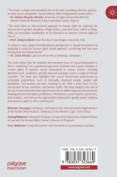 1. Sexual harassment, human rights and feminism.- 2. Towards a woman-centered approach in addressing sexual harassment in Africa.- 3. Protecting women with disabilities from sexual harassment in africa.- 4. Nowhere is safe for women: adopting a rights-based approach in addressing in-flight sexual harassment.- 5. The dynamics of sexual harassment against women and access to protection for victims in zimbabwe's informal sector.- 6. Addressing the epidemic of sexual harassment in idp camps in Nigeria.- 7. Sexual harassment: vulnerability of domestic workers in Nigeria.- 8. The legal framework on sexual harassment in eswatini - a critical review in light of the maputo protocol.- 9. Sexual harassment in the workplace in the gambia: an analysis of recent developments from a feminist perspective.- 10. Sexual harassment in the university workplace: the place of section 35(5) of south africa's constitution.- 11. The role of the courts in addressing sexual harassment in Nigeria.