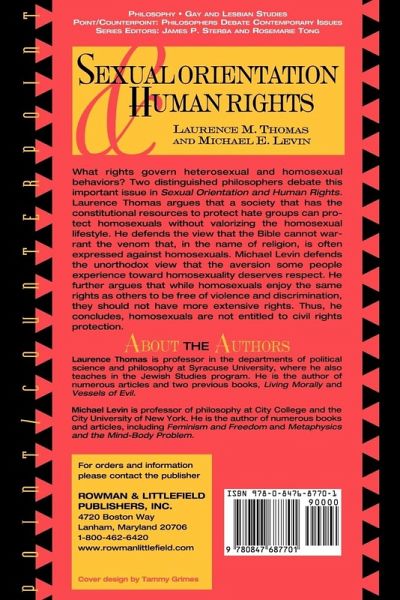 What rights govern heterosexual and homosexual behaviors? Two distinguished philosophers debate this important issue in Sexual Orientation and Human Rights. Laurence M. Thomas argues that a society which has the constitutional resources to protect hate groups can protect homosexuals without valorizing the homosexual life-style. He defends the view that the Bible cannot warrant the venom that, in the name of religion, is often expressed against homosexuals. Michael E. Levin defends the unorthodox view that the aversion some people experience toward homosexuality deserves respect. He further argues that while homosexuals enjoy the same rights as others to be free of violence and discrimination, they do not have more extensive rights.