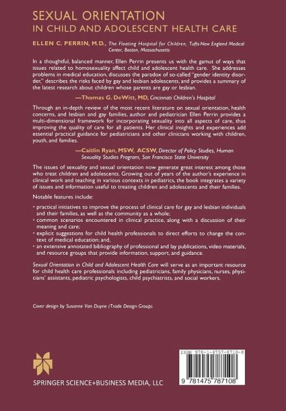 From the reviews: "The practical recommendations offered by Perrin will make her book valuable not only to pediatricians, but also to professionals who evaluate medical school curriculums and supervise residents. Sexual Orientation in Child and Adolescent Health Care will surely help health care professionals to embrace their homosexual patients and families and will educate those who have been unaware of the needs and experiences of a small, but nonetheless important, segment of the population." (New England Journal of Medicine, 348:6, February 2003) "In its writing, Perrin beautifully exemplifies the pediatrician engaged in matters of social justice[...] In general, the book is well written, easy to read, and ambitious in its scope. It will be a useful resource for medical students, residents, and clinicians looking for a practical synopsis of an ever-expanding body of information." (Gary Remafedi, MD, MPH, University of Minnesota in Archives of Pediatrics and Adolescent Medicine, 157, March 2003) "This is a well researched and written book and I recommend it to clinicians who care for children, young people and their families, as well as for medical educators who can influence curricula." (Professor Doris Young, University of Melbourne, VIC in Australian Family Physician, 32:1/2, Jan/Feb 2003) "Her book comprehensively documents the current deficiencies in the field, integrates research within clinical observations, and offers incisive theoretical and practical suggestions to aid pediatric health care professionals in serving the needs of their young homosexual patients, as well as the needs of children of gay or lesbian parents[....] The practical recommendations offered by Perrin will make her book valuable not only to pediatricians, but also to professionals who evaluate medical school curriculums and supervise residents." (Esther D. Rothblum, Ph.D., University of Vermont in New England Journal of Medicine, 348:6, February 2003)