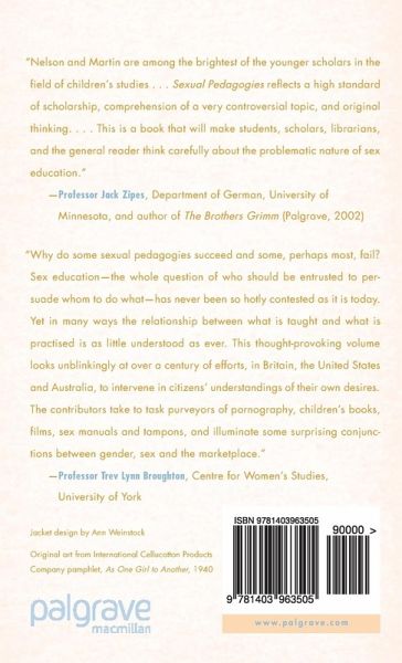 "Nelson and Martin are among the brightest of the younger scholars in the field of children's studies...Sexual Pedagogies reflects a high standard of scholarship, comprehension of a very controversial topic, and original thinking...This is a book that will make students, scholars, librarians, and the general reader think carefully about the problematic nature of sex education." - Jack Zipes, Department of German, University of Minnesota and author of The Brothers Grimm (Palgrave Macmillan, 2002)