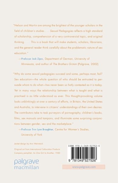 "Nelson and Martin are among the brightest of the younger scholars in the field of children's studies...Sexual Pedagogies reflects a high standard of scholarship, comprehension of a very controversial topic, and original thinking...This is a book that will make students, scholars, librarians, and the general reader think carefully about the problematic nature of sex education." - Jack Zipes, Department of German, University of Minnesota and author of The Brothers Grimm (Palgrave Macmillan, 2002)