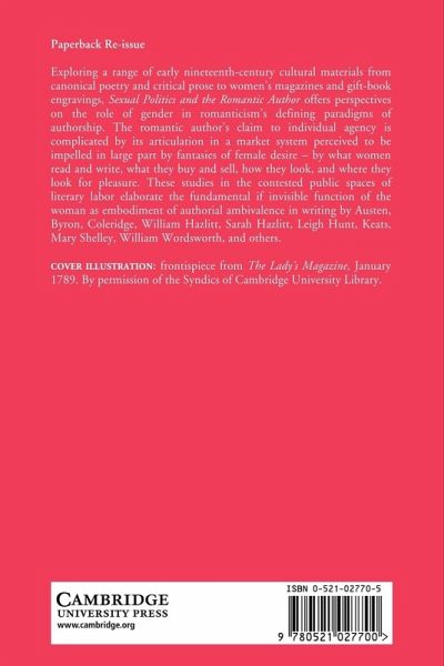Exploring a range of early nineteenth-century cultural materials from canonical poetry and critical prose to women's magazines and gift-book engravings, Sexual Politics and the Romantic Author offers new perspectives on the role of gender in Romanticism's defining paradigms of authorship. The Romantic author's claim to individual agency is complicated by its articulation in a market system perceived to be impelled in large part by fantasies of female desire - by what women read and write, what they buy and sell, how they look, and where they look for pleasure. These studies in the contested public spaces of literary labour elaborate the fundamental, if invisible, function of the woman as embodiment of authorial ambivalence in writing by Austen, Byron, Coleridge, William Hazlitt, Sarah Hazlitt, Leigh Hunt, Keats, Mary Shelley, William Wordsworth, and others.