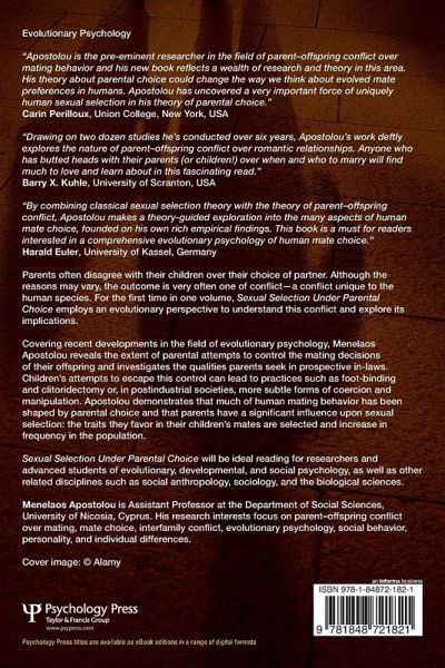 Parents often disagree with their children over their choice of partner. Although the reasons may vary the outcome is very often one of conflict - a conflict peculiar to the human species. For the first time in one volume, Sexual Selection under Parental Choice employs an evolutionary perspective to understand this conflict and explore its implications. Covering recent developments in the field of evolutionary psychology, Menelaos Apostolou reveals the extent of parental attempts to control the mating decisions of their offspring and investigates the qualities parents seek in prospective in-laws. Children's attempt to escape this control can lead to practices such as foot-binding and clitoridectomy or, in postindustrial societies, more subtle forms of coercion and manipulation. Apostolou demonstrates that much of human mating behavior has been shaped by parental choice and that parents have a significant influence in sexual selection: the traits they favour in their children's mates are selected and increase in frequency in the population. Sexual Selection under Parental Choice will be ideal reading for researchers and advanced students of evolutionary, developmental and social psychology, as well as other related disciplines such as social anthropology, sociology and the biological sciences.