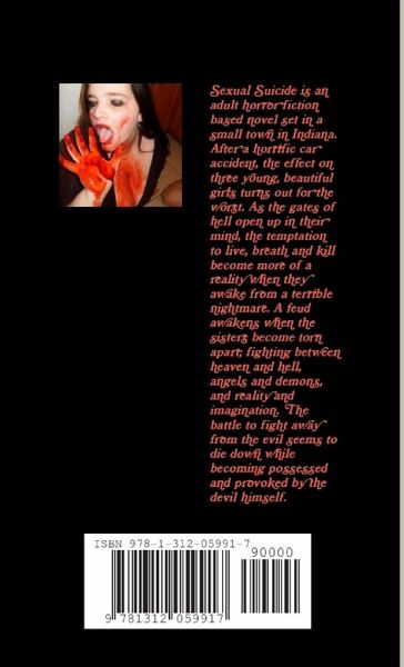 Sexual Suicide is an adult horror fiction based novel set in a small town in Indiana. After a horrific car accident, the effect on three young, beautiful girls turns out for the worst. As the gates of hell open up in their mind, the temptation to live, breath and kill become more of a reality when they awake from a terrible nightmare. A feud awakens when the sisters become torn apart; fighting between heaven and hell, angels and demons, and reality and imagination. The battle to fight away from the evil seems to die down while becoming possessed and provoked by the devil himself.