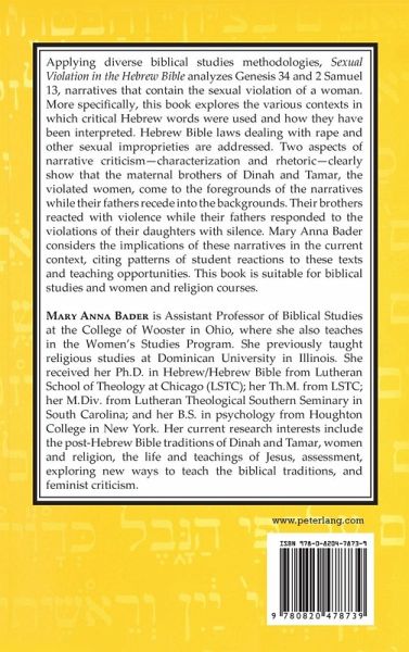 Applying diverse biblical studies methodologies, Sexual Violation in the Hebrew Bible, analyzes Genesis 34 and 2 Samuel 13, narratives that contain the sexual violation of a woman. More specifically, this book explores the various contexts in which critical Hebrew words were used and how they have been interpreted. Hebrew Bible laws dealing with rape and other sexual improprieties are addressed. Two aspects of narrative criticism - characterization and rhetoric - clearly show that the maternal brothers of Dinah and Tamar, the violated women, come to the foregrounds of the narratives while their fathers recede into the backgrounds. Their brothers reacted with violence while their fathers responded to the violations of their daughters with silence. Mary Ann Bader considers the implications of these narratives in the current context, citing patterns of student reactions to these texts and teaching opportunities. This book is suitable for biblical studies and women and religion courses.