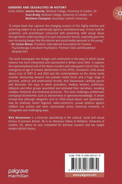 This book investigates the changes and continuities in the ways in which sexual violence has been interpreted and represented in Britain since 1965. It explores the representational trail of the Moors murders and subsequent trial of 1966, the emergence of age of consent abolitionism in the 1970s, Cleveland's child sexual abuse crisis of 1987-8, and 2010 and 20s contemplations on the Jimmy Savile scandal. Harnessing research into popular media forms and a huge range of personal, political and professional records, Nick Basannavar carefully parses and illustrates the ways in which journalists, medical workers, politicians, lobbyists and other groups assembled and animated their narratives, revealing complex rhetorical and emotional processes. This book challenges problematic conceptual dichotomies such as silence/noise or ignorance/knowledge. It shows instead that although categories such as 'child sexual abuse' and 'paedophilia' may be relatively recent linguistic value-constructs, sexual violence against children has existed and been represented across historical moments, in changeable and challenging ways.
