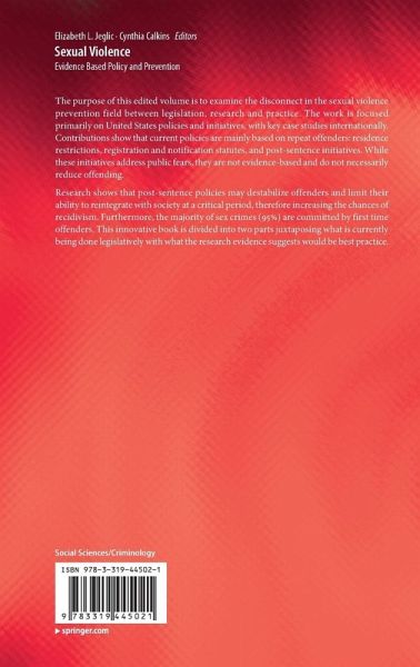 The purpose of this edited volume is to examine the disconnect in the sexual violence prevention field between legislation, research and practice. The work is focused primarily on United States policies and initiatives, with key case studies internationally. Contributions show that current policies are mainly based on repeat offenders: residence restrictions, registration and notification statutes, and post-sentence initiatives. While these initiatives address public fears, they are not evidence-based and do not necessarily reduce offending.