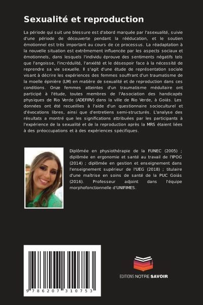 La période qui suit une blessure est d'abord marquée par l'asexualité, suivie d'une période de découverte pendant la rééducation, et le soutien émotionnel est très important au cours de ce processus. La réadaptation à la nouvelle situation est extrêmement influencée par les aspects sociaux et émotionnels, dans lesquels l'individu éprouve des sentiments négatifs tels que l'angoisse, l'incrédulité, l'anxiété et le désespoir face à la nécessité de reprendre sa vie sexuelle. Il s'agit d'une étude de représentation sociale visant à décrire les expériences des femmes souffrant d'un traumatisme de la moelle épinière (LM) en matière de sexualité et de reproduction dans ces conditions. Onze femmes atteintes d'un traumatisme médullaire ont participé à l'étude, toutes membres de l'Association des handicapés physiques de Rio Verde (ADEFIRV) dans la ville de Rio Verde, à Goiás. Les données ont été recueillies à l'aide d'un questionnaire socioculturel et d'évocations libres, ainsi que d'entretiens semi-structurés. L'analyse des résultats a montré que les significations attribuées par les participants à l'expérience de la sexualité et de la reproduction après la MRS étaient liées à des préoccupations et à des expériences spécifiques.