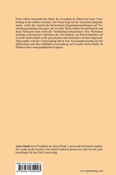 Diese Arbeit untersucht das Motiv der Sexualität als Rätsel und seine Verarbeitung in der antiken Literatur. Ein Fokus liegt auf der römischen Epigrammatik, wobei die Autorin die betrachteten Epigrammsammlungen auf Verrätselungsstrategien bezogen auf sexuelle Sachverhalte hin durchsucht und diese Strategien nach Arten der Verrätselung kategorisiert. Eine Wortuntersuchung systematisiert außerdem die Anwendung von Rätselvokabular auf sexuelle Sachverhalte in der griechischen und römischen Literatur insgesamt. Abgerundet wird die Untersuchung durch eine Auseinandersetzung mit der Sphinxfigur und ihrer bildhaften Anwendung auf sexuelle Sachverhalte im Rahmen eines monographischen Kapitels.