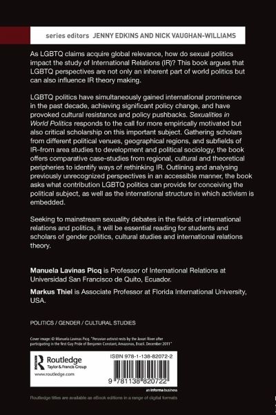 As LGBTQ claims acquire global relevance, how do sexual politics impact the study of International Relations? This book argues that LGBTQ perspectives are not only an inherent part of world politics but can also influence IR theory-making. LGBTQ politics have simultaneously gained international prominence in the past decade, achieving significant policy change, and provoked cultural resistance and policy pushbacks. Sexuality politics, more so than gender-based theories, arrived late on the theoretical scene in part because sexuality and gender studies initially highlighted post-structuralist thinking, which was hardly accepted in mainstream political science. This book responds to a call for a more empirically motivated but also critical scholarship on this subject. It offers comparative case-studies from regional, cultural and theoretical peripheries to identify ways of rethinking IR. Further, it aims to add to critical theory, broadening the knowledge about previously unrecognized perspectives in an accessible manner. Being aware of preoccupations with the de-queering, disciplining nature of theory establishment in the social sciences, we critically reconsider IR concepts from a particular LGBTQ vantage point and infuse them with queer thinking. Considering the relative dearth of contemporary mainstream IR-theorizing, authors ask what contribution LGBTQ politics can provide for conceiving the political subject, as well as the international structure in which activism is embedded. This book will be of interest to students and scholars of gender politics, cultural studies and international relations theory.