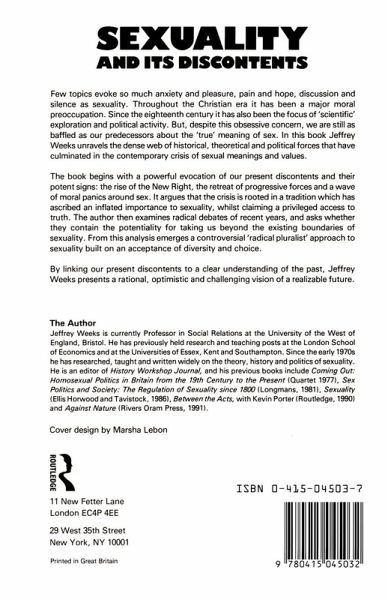 Few topics evoke so much anxiety and pleasure, pain and hope, discussion and silence as sexuality. Throughout the Christian era it has been a major moral preoccupation. Since the eighteenth century it has also been the focus of 'scientific' exploration and political activity. But, despite this obsessive concern, we are still as baffled as our predecessors about the 'true' meaning of sex. In this book Jeffrey Weeks unravels the dense web of historical, theoretical and political forces that have culminated in the contemporary crisis of sexual meanings and values. The book begins with a powerful evocation of our present discontents and their potent signs: the rise of the New Right, the retreat of progressive forces and a wave of moral panics around sex. It argues that this crisis is rooted in a tradition which has ascribed an inflated importance to sexuality, whilst claiming a privileged access to truth. The author then examines radical debates of recent years, and asks whether they contain the potentiality for taking us beyond the existing boundaries of sexuality. From this analysis emerges a controversial 'radical pluralist' approach to sexuality built on an acceptance of diversity and choice. By linking our present discontents to a clear understanding of the past, Jeffrey Weeks presents a rational, optimistic and challenging vision of a realizable future.