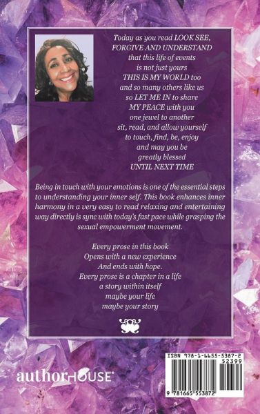 Today as you read LOOK SEE, FORGIVE AND UNDERSTAND that this life of events is not just yours THIS IS MY WORLD too and so many others like us so LET ME IN to share MY PEACE with you one jewel to another sit, read, and allow yourself to touch, find, be, enjoy and may you be greatly blessed UNTIL NEXT TIME Being in touch with your emotions is one of the essential steps to understanding your inner self. This book enhances inner harmony in a very easy to read relaxing and entertaining way directly is sync with today's fast pace while grasping the sexual empowerment movement. Every prose in this book Opens with a new experience And ends with hope. Every prose is a chapter in a life a story within itself maybe your life maybe your story