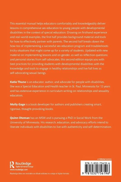 This essential manual helps educators comfortably and knowledgeably deliver lessons in comprehensive sex education to young people with developmental disabilities in the context of special education. Drawing on firsthand experience and real-world examples, the first half provides background material and tools for how to effectively partner with parents. The second half breaks down the how-tos of implementing a successful sex education program and troubleshoots tricky situations that might come up for a variety of students. Updated with new material on implementing lessons and on gender, as well as reflection questions and personal stories from self-advocates, this second edition equips you with best practices for providing students with developmental disabilities with the knowledge and tools to engage in healthy relationships and live full lives as self-advocating sexual beings.
