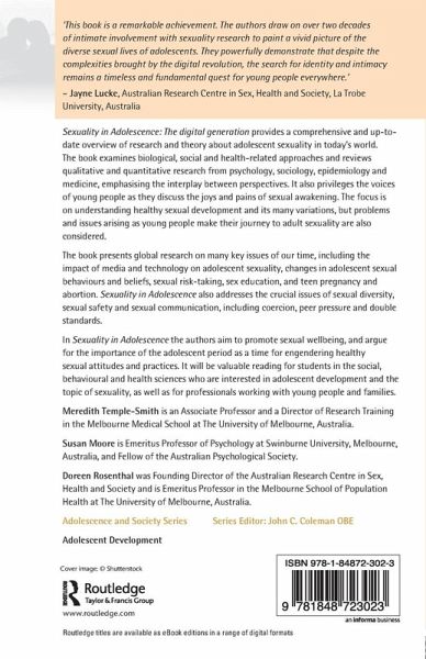 Sexuality in Adolescence: The Digital Generation provides a comprehensive and up-to-date overview of research and theory about adolescent sexuality in today's world. The book examines biological, social and health-related approaches and reviews qualitative and quantitative research from psychology, sociology, epidemiology and medicine, emphasising the interplay between perspectives and privileging the voices of young people as they discuss the joys and pains of sexual awakening. The focus is on understanding healthy sexual development and its many variations, but problems and issues arising as young people make their journey to adult sexuality are also considered. The book presents global research on many key issues of our time, including the impact of media and technology on adolescent sexuality, changes in adolescent sexual behaviors and beliefs, sexual risk taking, sex education, and teen pregnancy and abortion. This fully revised and updated third edition of Sexuality in Adolescence also addresses the crucial issues of sexual diversity, sexual safety and sexual communication, including coercion, peer pressure and double standards. In Sexuality in Adolescence: The Digital Generation, the authors aim to promote sexual wellbeing, and argue for the importance of the adolescent period as a time for engendering healthy sexual attitudes and practices. This book will be valuable reading for students in the social, behavioural and health sciences who are interested in adolescent development and the topic of sexuality, as well as for professionals working with young people and families.