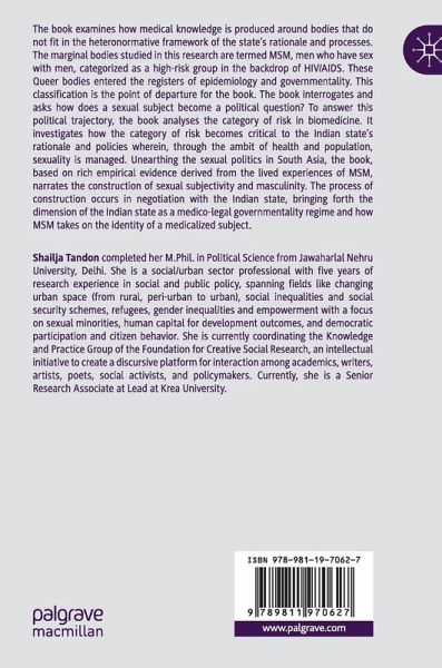 The book examines how medical knowledge is produced around bodies that do not fit in the heteronormative framework of the state's rationale and processes. The marginal bodies studied in this research are termed MSM, men who have sex with men, categorized as a high-risk group in the backdrop of HIV/AIDS. These Queer bodies entered the registers of epidemiology and governmentality. This classification is the point of departure for the book. The book interrogates and asks how does a sexual subject become a political question? To answer this political trajectory, the book analyses the category of risk in biomedicine. It investigates how the category of risk becomes critical to the Indian state's rationale and policies wherein, through the ambit of health and population, sexuality is managed. Unearthing the sexual politics in South Asia, the book, based on rich empirical evidence derived from the lived experiences of MSM, narrates the construction of sexual subjectivity and masculinity. Theprocess of construction occurs in negotiation with the Indian state, bringing forth the dimension of the Indian state as a medico-legal governmentality regime and how MSM takes on the identity of a medicalized subject.