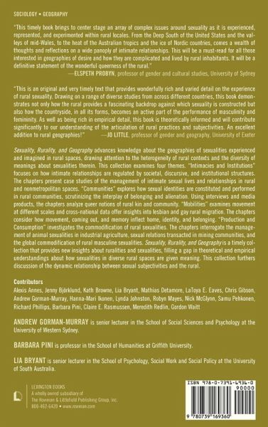 This edited book offers a detailed examination of the interstices of ruralities and sexualities over a number of different countries, focusing a geographical lens on the relationships between sexualities and the spaces and tropes of rural life. Collectively, the contributors reveal how sexual identities, imaginaries and experiences are understood and practiced in relation to intimacies, institutions, mobilities, communities, and economic and social modes of production and consumption.