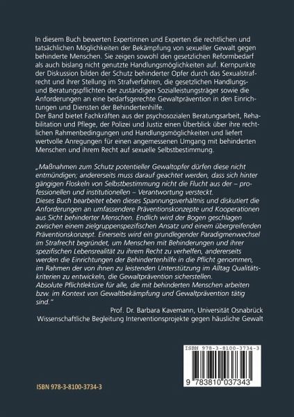 Einführung.- I Sexuelle Gewalt gegen behinderte Menschen und das Sexualstrafrecht.- Werden behinderte Frauen durch das Sexualstrafrecht diskriminiert? Eine Einführung in die gegenwärtige Reformdiskussion.- Der Stellenwert der Selbstbestimmung behinderter Menschen im Sexualstrafrecht.- Expertlnnendiskussion I: Brauchen wir eine Reform des Sexualstrafrechts?.- Expertlnnendiskussion II: Anforderungen an die Strafverfolgung.- II Sozialrechtliche Gegenstrategien.- Mit dem Sozialrecht gegen sexualisierte Gewalt? - Warum sich Sozialleistungsträger und Sozialleistungserbringer Gedanken machen sollten.- Zur Prävention sexualisierter Gewalt in der Rehabilitation: Schutzpflichten der Leistungsträger gegenüber den Leistungsempfängerinnen.- Expertlnnendiskussion III: Die gesetzlichen Schutzpflichten der Leistungsträger und deren Umsetzung in der Praxis.- Gewaltprävention durch Qualitätssicherung in der Behindertenhilfe.- Expertlnnendiskussion IV: Gewaltprävention in der Behindertenhilfe als neue Anforderung an die Leistungsqualität.- III Expertisen.- Selbstbestimmung und Behinderung - Wertungswidersprüche im Sexualstrafrecht?.- Die Schutzpflichten des Rehabilitationsleistungsträgers gegenüber der Leistungsempfängerin in Bezug auf sexualisierte Gewalt.- Qualitätssicherung - ein Instrument von Gewaltprävention?.- VI Anhang.- Ergebnisse des Rechtssymposiums (Zusammenfassung).- Bundesministerium der Justiz Bericht zu 179 StGB (Stand: März 2001).- Die Mitwirkenden/Das Rechtsprojekt.