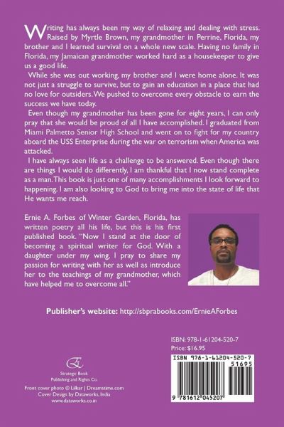Writing has always been my way of relaxing and dealing with stress. Raised by Myrtle Brown, my grandmother in Perrine, Florida, my brother and I learned survival on a whole new scale. We had no other family in Florida, so my Jamaican grandmother worked hard as a housekeeper to give us a good life.While she was out working, my brother and I were home alone. It was not just a struggle to survive, but to gain an education in a place that had no love for outsiders. We pushed to overcome every obstacle to earn the success we have today.Even though my grandmother has been gone for many years now, I can only pray that she would be proud of all I have accomplished. I graduated from Miami Palmetto Senior High School and went on to fight for my country aboard the USS Enterprise during the war on terrorism when America was attacked.I have always seen life as a challenge to be answered. Even though there are things I would do differently, I am thankful that I now stand complete as a man. This book is just one of many accomplishments I look forward to happening. I am also looking to God to bring me into the state of life that He wants me reach.Ernie A. Forbes of Winter Garden, Florida, has written poetry all his life, but this is his first published book. "Now I stand at the door of becoming a spiritual writer for God. With a daughter under my wing, I pray to share my passion for writing with her as well as introduce her to the teachings of my grandmother, which have helped me to overcome all."Publisher's website: http://sbprabooks.com/ErnieAForbes