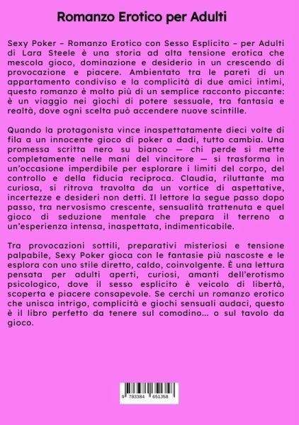 Sexy Poker - Romanzo Erotico con Sesso Esplicito - per Adulti di Lara Steele è una storia ad alta tensione erotica che mescola gioco, dominazione e desiderio in un crescendo di provocazione e piacere. Ambientato tra le pareti di un appartamento condiviso e la complicità di due amici intimi, questo romanzo è molto più di un semplice racconto piccante: è un viaggio nei giochi di potere sessuale, tra fantasia e realtà, dove ogni scelta può accendere nuove scintille.Quando la protagonista vince inaspettatamente dieci volte di fila a un innocente gioco di poker a dadi, tutto cambia. Una promessa scritta nero su bianco - chi perde si mette completamente nelle mani del vincitore - si trasforma in un'occasione imperdibile per esplorare i limiti del corpo, del controllo e della fiducia reciproca. Claudia, riluttante ma curiosa, si ritrova travolta da un vortice di aspettative, incertezze e desideri non detti. Il lettore la segue passo dopo passo, tra nervosismo crescente, sensualità trattenuta e quel gioco di seduzione mentale che prepara il terreno a un'esperienza intensa, inaspettata, indimenticabile.Tra provocazioni sottili, preparativi misteriosi e tensione palpabile, Sexy Poker gioca con le fantasie più nascoste e le esplora con uno stile diretto, caldo, coinvolgente. È una lettura pensata per adulti aperti, curiosi, amanti dell'erotismo psicologico, dove il sesso esplicito è veicolo di libertà, scoperta e piacere consapevole. Se cerchi un romanzo erotico che unisca intrigo, complicità e giochi sensuali audaci, questo è il libro perfetto da tenere sul comodino... o sul tavolo da gioco.