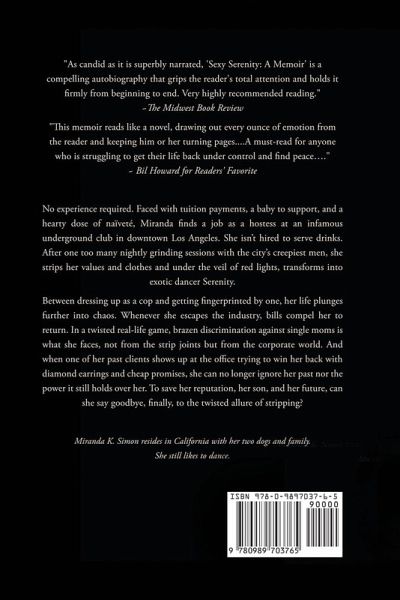 "No matter what anyone says, I'm not a whore." That becomes Miranda K. Simon's daily mantra as she struggles to save both her soul and her sanity dancing in some of the seediest strip clubs in Hollywood and Las Vegas. Her biggest challenge: Can she make it out of this shady underworld with her self-worth, ambitions, and priorities as a mother intact? "Sexy Serenity" is Miranda's unabashed diary of her life as a young college student who is forced by poverty to betray her long-held morals and become a dance hostess at an infamous underground club in downtown Los Angeles. With a one-year-old son, nowhere else to turn, and a hearty dose of naïveté, she does what she must to make ends meet. From the beginning of her new career, Miranda constantly struggles to adapt to nightly grinding sessions with the city's creepiest men and the pressure to date clients outside of the club. When she feels her safety has been compromised, she tries to escape hostess clubs and her clients by stripping off her values and her clothes. She transforms herself into exotic dancer "Serenity," a woman who has no problem getting naked for men and refuses to cry every night about it. Between dressing up as a cop and being fingerprinted by one, Miranda's life plunges into chaos. After earning (and paying for) her college degree, she lands a new corporate job but faces brazen discrimination against single mothers. She still can't afford rent so she's compelled to work weekends at the clubs. It seems every time she attempts to quit dancing, some new expense gets in her way. But when one of her past clients shows up at her office, trying to win her back with diamond earrings and cheap promises, Miranda can no longer ignore her past nor the power it still has over her. In order to save her reputation, her son, and her future, can she say goodbye, finally, to the twisted allure of stripping?