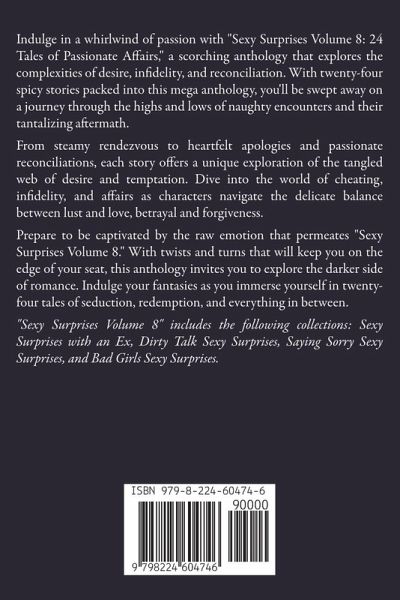 Indulge in a whirlwind of passion with "Sexy Surprises Volume 8: 24 Tales of Passionate Affairs," a scorching anthology that explores the complexities of desire, infidelity, and reconciliation. With twenty-four spicy stories packed into this mega anthology, you'll be swept away on a journey through the highs and lows of naughty encounters and their tantalizing aftermath. From steamy rendezvous to heartfelt apologies and passionate reconciliations, each story offers a unique exploration of the tangled web of desire and temptation. Dive into the world of cheating, infidelity, and affairs as characters navigate the delicate balance between lust and love, betrayal and forgiveness. Prepare to be captivated by the raw emotion that permeates "Sexy Surprises Volume 8." With twists and turns that will keep you on the edge of your seat, this anthology invites you to explore the darker side of romance. Indulge your fantasies as you immerse yourself in twenty-four tales of seduction, redemption, and everything in between. "Sexy Surprises Volume 8" includes the following collections: Sexy Surprises with an Ex, Dirty Talk Sexy Surprises, Saying Sorry Sexy Surprises, and Bad Girls Sexy Surprises.