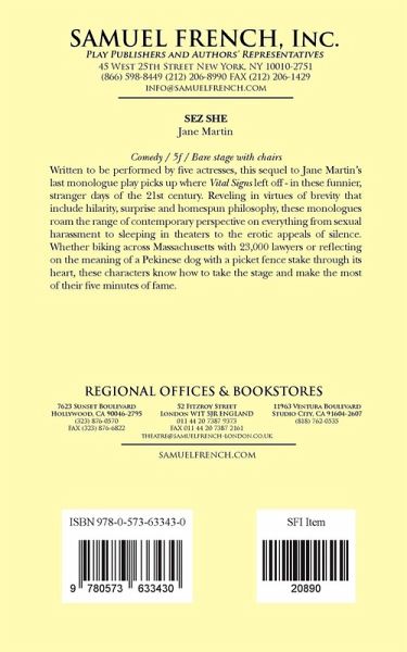 Full Length, Comedy Characters: 5 female Bare stage with chairs Written to be performed by five actresses, this sequel to Jane Martin's last monologue play picks up where VITAL SIGNS left off - in these funnier, stranger days of the 21st century. Reveling in virtues of brevity that include hilarity, surprise and homespun philosophy, these monologues roam the range of contemporary perspective on everything from sexual harassment to sleeping in theaters to the erotic appeals o