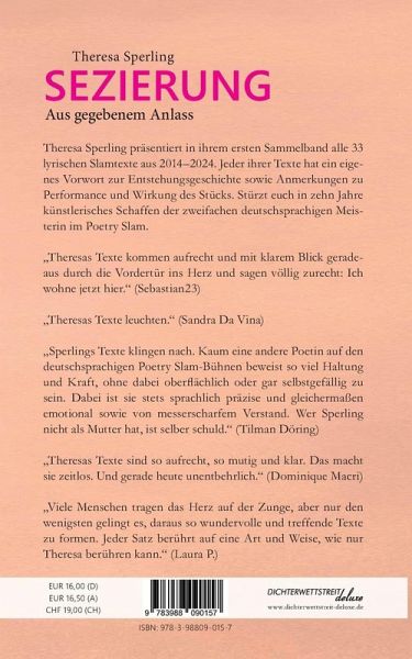 Theresa Sperling präsentiert in ihrem ersten Sammelband alle 33 lyrischen Slamtexte aus 2014¿2024. Jeder ihrer Texte hat ein eigenes Vorwort zur Entstehungsgeschichte sowie Anmerkungen zu Performance und Wirkung des Stücks. Stürzt euch in zehn Jahre künstlerisches Schaffen der zweifachen deutschsprachigen Meisterin im Poetry Slam. ¿Theresas Texte kommen aufrecht und mit klarem Blick geradeaus durch die Vordertür ins Herz und sagen völlig zurecht: Ich wohne jetzt hier.¿ (Sebastian23) ¿Theresas Texte leuchten.¿ (Sandra Da Vina) ¿Sperlings Texte klingen nach. Kaum eine andere Poetin auf den deutschsprachigen Poetry Slam-Bühnen beweist so viel Haltung und Kraft, ohne dabei oberflächlich oder gar selbstgefällig zu sein. Dabei ist sie stets sprachlich präzise und gleichermaßen emotional sowie von messerscharfem Verstand. Wer Sperling nicht als Mutter hat, ist selber schuld.¿ (Tilman Döring) ¿Theresas Texte sind so aufrecht, so mutig und klar. Das macht sie zeitlos. Und gerade heute unentbehrlich.¿ (Dominique Macri) ¿Viele Menschen tragen das Herz auf der Zunge, aber nur den wenigsten gelingt es, daraus so wundervolle und treffende Texte zu formen. Jeder Satz berührt auf eine Art und Weise, wie nur Theresa berühren kann.¿ (Laura P.)