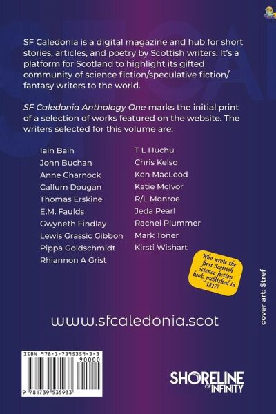Short stories, poetry and essays by Scottish Science Fiction, fantasy and speculative fiction writers. This is a special colour edition, printed on heavier-weight paper. SF Caledonia is a free online magazine and resource of science fiction short stories, articles and poetry by Scottish writers. It's a space for Scotland to show off its talented community of science fiction/ speculative fiction/fantasy writers to the world - and beyond. Visit the website at www.sfcaledonia.scot where you will be able to find out all about it. SF Caledonia Anthology One is the first print gathering of pieces published on the website, and is already showing the range of talents. Who knew that John Buchan, he of The Thirty-Nine Steps and Governer General of Canada wrote a scifi short story? Also too, Lewis Grassic Gibbon, writing under his real name of James Leslie Mitchell. And wait 'til you find out who wrote the very first Scottish science fiction novella, published in 1817, yes, the year before Mary Shelley's Frankenstein was published. There must have been something in the air in the early 1900s. In Scotland science fiction is alive and well, thriving. This collection features a number of Scottish writers we have published in the award-winning Shoreline of Infinity Science Fiction Magazine, some of whom we have enjoyed helping to nurture on their way. We can only publish a small sample in book format, so do come along to the website where we are publishing freshly donated stories and articles every month. By buying this anthology, you are helping to support the development of SF Caledonia, and the Scottish writers of science fiction, fantasy and speculative fiction. Pick your choice: the Special Edition, with colour artwork and design throughout, and printed on heavier paper; the classic black and white paperback. Writers included are: Iain Bain John Buchan Anne Charnock Callum Dougan Thomas Erskine E.M. Faulds Gwyneth Findlay Lewis Grassic Gibbon Pippa Goldschmidt Rhiannon A Grist T L Huchu Chris Kelso Ken MacLeod Katie McIvor R/L Monroe Jeda Pearl Rachel Plummer Mark Toner Kirsti Wishart